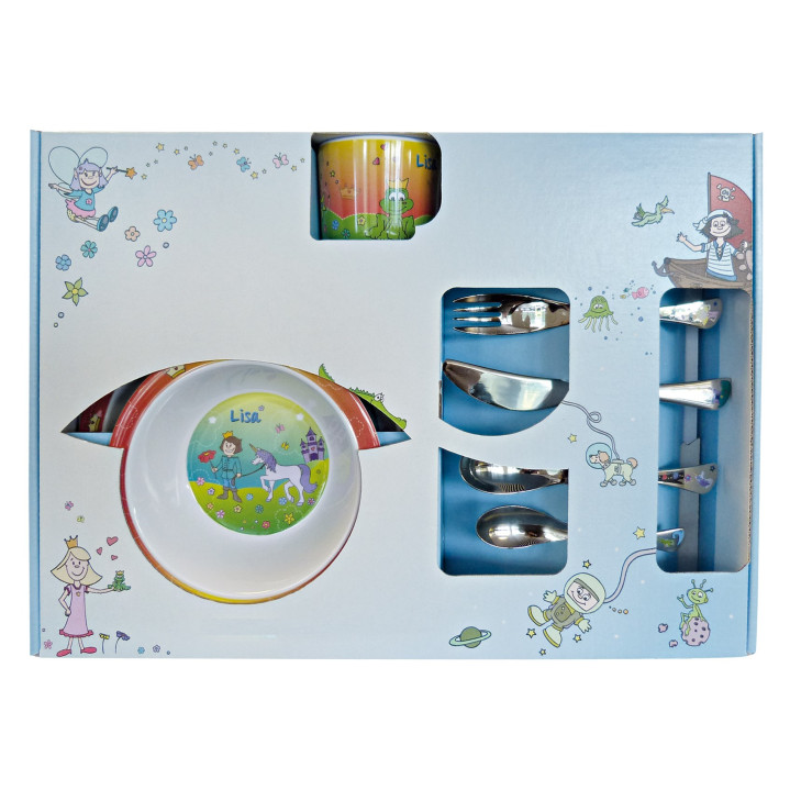 Cuchara, tenedor, cuchillo, cucharilla de postre, taza, plato y bol
